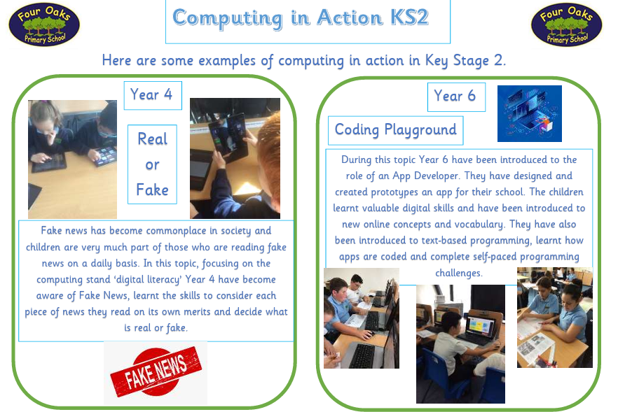 At Four Oaks Primary School, we believe it is our responsibility to provide all children with the skills and knowledge to manage an ever-changing and increasingly technological world. A high-quality computing curriculum equips pupils to use computational thinking and creativity to understand and change the world. We will ensure our children embody our core value to ‘strive to be the best we can be’.