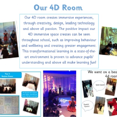 We believe that technology can provide enhanced collaborative learning opportunities, better engagement of pupils and access to a range of innovative, exciting software to explore the technological world around them. For example, our children are able to enrich their learning across the curriculum by through the use of our state-of-the-art 4D room. This uses projected video footage on floor-to-ceiling screens, sound, lighting, and an interactive floor space to create an ‘immersive’ experience. When Little Acorns read ‘We’re going on a Bear Hunt’, the 4D room enabled the children to be immersed in the different stages of the story. The children then paired actions with the different parts of the story. The experience our children receive in the 4D room is priceless as it ignites curiosity in understanding how the technology is used and programmed for a purpose whilst providing an immersive experience within a topic.