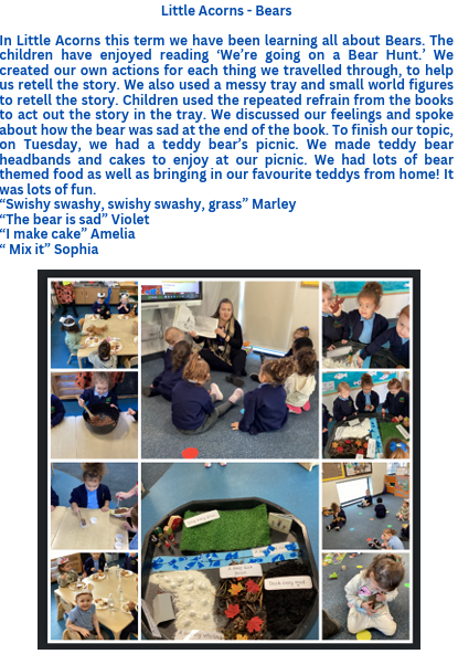 In Little Acorns and Nursery, children are exposed to communication and language games to develop listening and speaking skills. The activities develop general sound discrimination, rhythm and rhyme, alliteration and voice sounds.  The children have opportunities to work in small groups and activities are embedded into the continuous provision to support children’s learning and development.