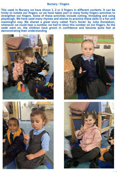 In 3-4 Nursery in line with evidence from the EEF, children are taught the foundations of Mathematics in a dedicated group input each day which follows the Nursery White Rose scheme of work. In addition, opportunities are taken to explore mathematics through naturally occurring moments throughout the day e.g. morning routines to model language in context and allows pupils to explore concepts in wider contexts e.g. stories, songs and games. Our enabling environments provide opportunities for children to independently explore number and numerical patterns; high-quality interactions and sustained shared thinking extend children’s thinking and support pupils’ in developing their understanding.