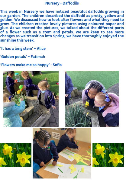 All children are encouraged to become independent learners, exploring and investigating to solve problems and misconceptions. Children are provided, through both adult led and continuous provision enhancements, with relevant and purposeful opportunities to explore the world around them. Children are encouraged to independently explore, to solve problems, to investigate, to make decisions and experiment.  They will learn about living things, their environment, the world, history and the people who are important in their lives.  All children are exposed to the wider world around them including different cultures, foods, religion, languages and ways of life. Children are exposed to a wide variety of first-hand experiences to ensure children are immersed in their learning.