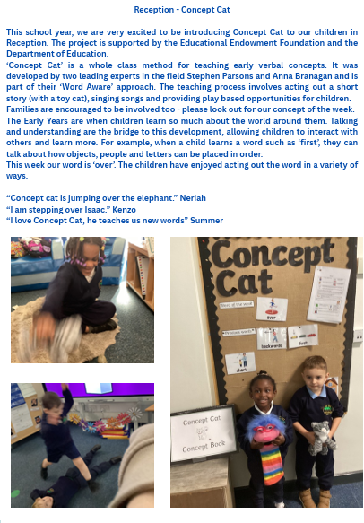 We follow the ‘RWI Phonics’ programme and the order in which the sounds are taught for Reception Class.