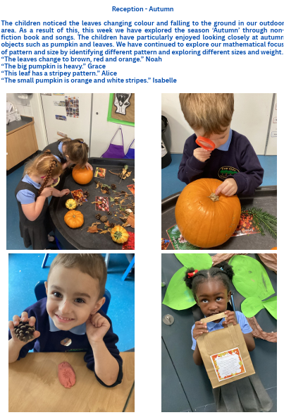 Our children develop detailed knowledge and skills across all seven areas of learning by the end of Reception and are ready for their next stage of their education in Year 1. Those children who do not meet all the goals at the end of Reception make great personal progress from their starting points. Our curriculum builds solid physical and emotional foundations which are enhanced by a smooth transition into Year 1.