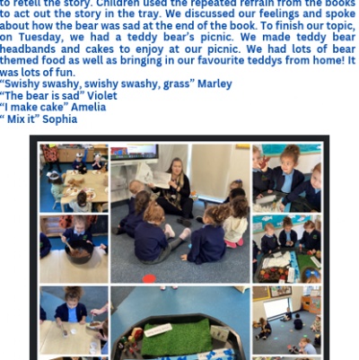 In Reception and Nursery, we use the Narrative Immersion approach to support the children’s literacy development. All literacy work is based around ‘vehicle text’, that is of high quality. The units of work centre on engaging, vocabulary-rich texts that support a wide range of writing opportunities. Many of the ‘vehicle texts’ used, also have strong thematic links to the other areas of the Early Years Foundation Stage curriculum.