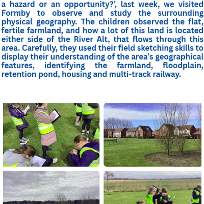 In Year Four, pupils enjoy an enrichment trip charting the journey of the River Alt. The children use their classroom learning in context, identifying river features and adjacent land use at different points along the river. They learn how land drainage and marsh land in Huyton quickly develops into a river, gathering pace and changing shape and direction as it flows towards its mouth at Hightown. As with all other stages of the geography curriculum at Four Oaks, this experience is part of a wider learning experience. In Year 5, the children visit this area again, observing a panorama of the floodplains and flat farmland of Altcar and Formby, comparing its uses with that of the fertile Grésivaudan valley on the banks of the Isère river in France. In History and Geography in UKS2, the children are able to revisit and broaden their learning through topics looking at the docklands of Liverpool, their use and importance through time and their resurgence through regeneration and gentrification.
