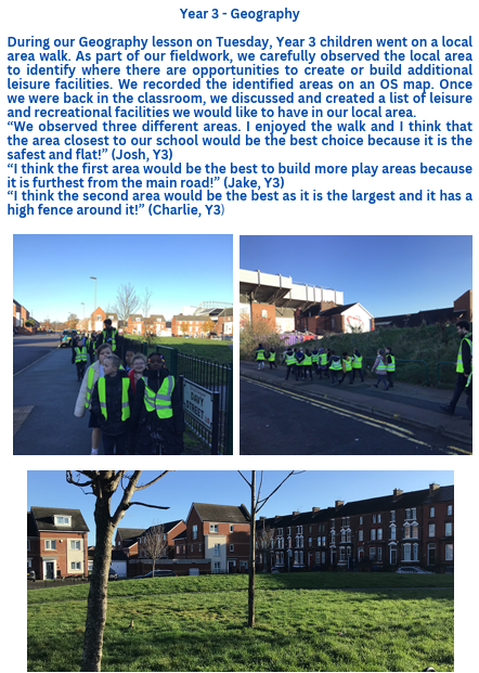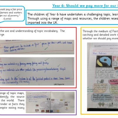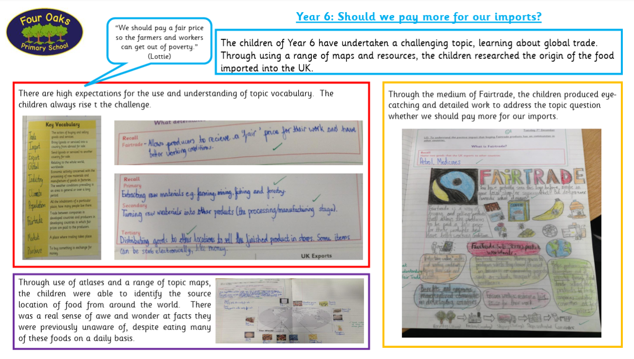 The geography curriculum at Four Oaks Primary School is based upon the 2014 Primary National Curriculum in England, which provides a broad framework and outlines the knowledge and skills taught in each Key Stage. The geography curriculum has been very carefully designed: identifying school-specific drivers and strands to run through all key stages; connecting and revisiting topics and key themes; identifying and highlighting prior learning and future learning; choosing relevant and engaging topics/themes/locations; creating clear and concise MTPs for staff to follow to ensure greater standardisation. Geography teaching focuses on enabling children to think as geographers. Geography provides opportunities to enhance the learning of all pupils through fieldwork, analysing data, map reading and making, and producing reports. All topics are titled with questions – children use their learning from throughout the topic to answer these questions.