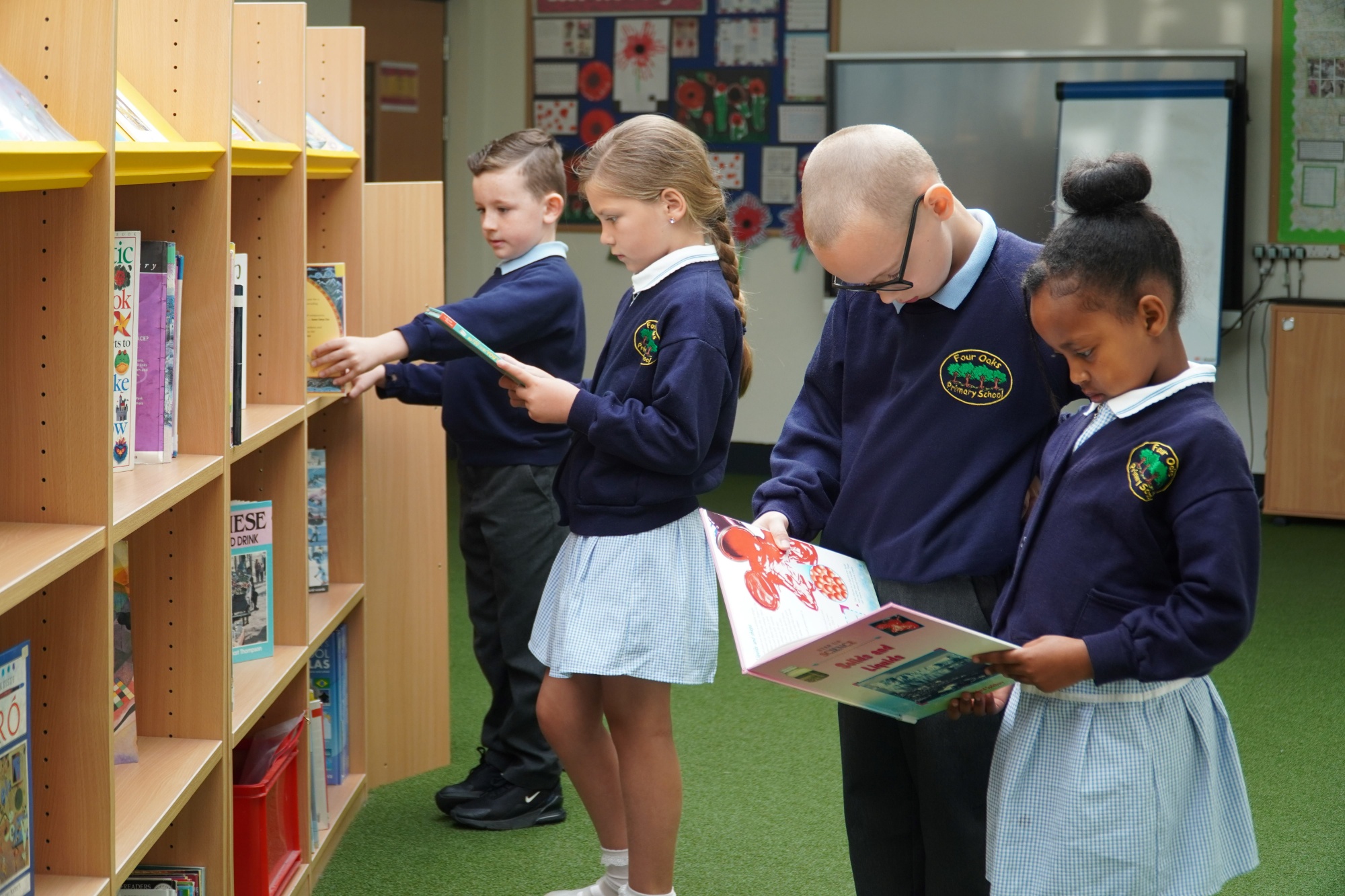 Our library is a fantastic place to read, study, and relax. We offer a diverse collection of books, comics, newspapers, and audio stories, including bilingual resources to support our Modern Foreign Language lessons. Students can unwind on comfy chairs or step into the immersive 4D Pod, where dynamic lighting, images, and sound bring stories to life! A captivating History timeline spans the entire library wall, showcasing fascinating facts and pictures from the Stone Age right up to the building of Four Oaks (now Thomas Gray Primary).