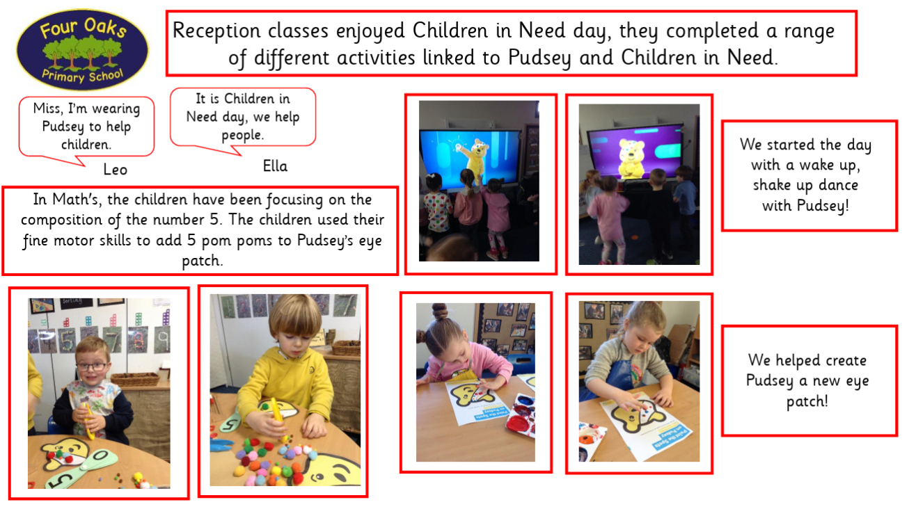 We want our children to use the vibrancy of our great city and surrounding areas to learn from other cultures, respect diversity, co-operate with one another and appreciate what they have. We achieve this by providing a strong SMSC curriculum, with Four Oaks’ British ‘Golden’ Values at the heart of everything we do. This feeds strongly into the PSHE curriculum. For example, our pupils are encouraged to celebrate nationally recognised themed days and Four Oaks celebrate and raise awareness for as many charities as we can. In November, the children raised awareness for Children in Need. In December, the children celebrated Christmas Jumper Day for ‘Save the Children UK.’ Last October, we celebrated World Mental Health as a week-long focus and we had a different theme each day. We had ‘Mindfulness Monday’, ‘Talking Tuesday’, ‘Wiggle Wednesday’, ‘Thinking Thursday’ and ‘Funny Friday’. We explored different ways in which we can improve our mental well-being whether it was through movement, meditation, laughter, or by sharing our thoughts and feelings.